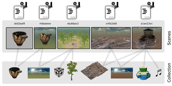 A scene may indeed also consist of a single item (e.g., a 3D model) suitable for 3D galleries of online virtual museums, with each scene corresponding to a single collection item. Within a DN, each scene is assigned a unique identifier (a Scene-ID, or “sid” for short) in the form of a string (e.g., “e45huoj78”, “demo/skyphos”, “user3/site2/reconstruction”) which can be used by any ATON-based web-app to address a specific published 3D scene (see Figure 4). The scene itself is stored as a compact JSON file (scene descriptor), similar to the svx JSON used by Voyager (https://smithsonian.github.io/dpo-voyager/explorer/scene-create/, accessed on 22 November 2021). Scenes are thus very cheap in terms of storage (data layer) compared to collections. The JSON format offers direct manipulations by local ATON services, third-party services or web-based tools—as well as guaranteeing full extensibility. Several libraries (e.g., Three.js, Babylon.js, etc.) already provide import/export routines for entire scenes in their own JSON format, although they usually store information not required for CH scopes. ATON has the goal of keeping the JSON scene descriptor very light, since it targets a specific subset of features targeting Cultural Heritage (scene-graph, semantic graphs, soundscape, viewpoints, general scene information, etc.) that will be discussed in the next sections.