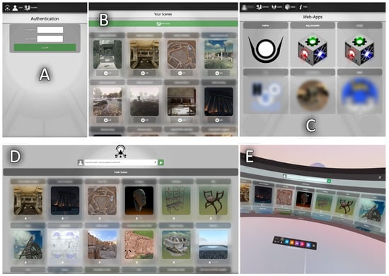 Shu back-end. Authentication (A); private scenes gallery (B); web-applications gallery (C); public landing page on standard browser (D) and immersive browser (E) using the Oculus Quest 2.
