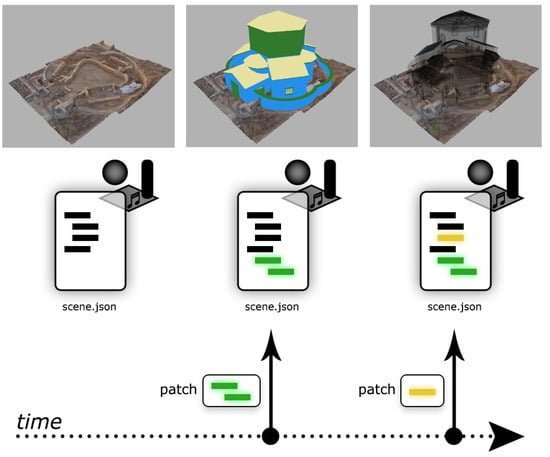 Once a 3D scene is published (i.e., it has a unique ID assigned), updating or manipulating its items at runtime using a front-end or presenter is possible through proper interfaces (e.g., transforming objects, adding annotations, etc.) but making these changes persistent requires direct intervention on the corresponding JSON descriptor (see Section 3.2). It is quite natural to expect routines that allow authenticated users to change, update, annotate, fine-tune or modify their scene in a persistent manner. Scene patches allow client web-apps to send compact partial edits (patches) to the DN through the REST API in order to modify a given scene and its corresponding JSON file. Such approach is based on JSON patches [52], a format for describing changes to a JSON document, that fully suits the scene descriptors of the ATON framework.