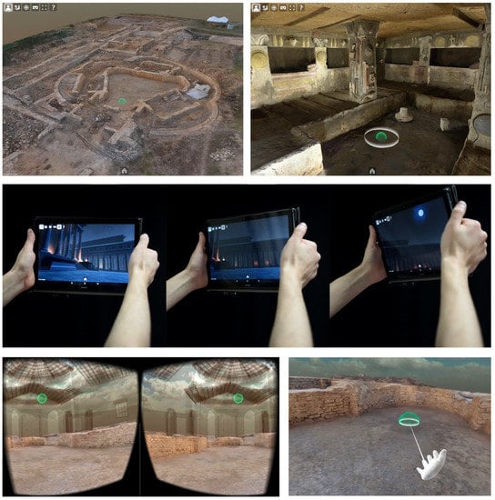 It is not unusual to visit museums or archaeological sites that offer technological solutions in the form of mobile applications to augment or enrich the visitors’ experience using their own devices. In order to consume such interactive experiences, generally visitors have to install applications or third-party software on their smartphones/tablets. From a developer perspective, stores (e.g., Apple store, Google Play, etc.) have precise guidelines and review processes that sometimes can be fairly complex or result in prolonged acceptance times, especially regarding immersive VR applications. Another challenge for developers arises from traditional application development, where the re-use of code between native solution, web-application and immersive VR solution is very poor, thus leading to the multiplication of effort. Regarding cross-device applications, from a design standpoint several challenges arise not only related to the responsiveness of the application (different screen sizes require adaptable user interfaces) but also to the interaction model adopted. For instance, exploring/inspecting a 3D scene through a multi-touch device and through an HMD (immersive VR) require radically different interaction models [1]. This generally leads to the development of different products for different devices, thus creating—once again—fragmentation. Main challenges usually identified in the literature within potentially complex 3D scenes consumed on the web include: (a) network traffic; (b) web-app memory footprint; (c) rendering performance. Immersive computing introduces additional demands and performance requirements for low-latency communication in order to deliver a consistent, smooth and acceptable experience. These have to be taken into strong consideration, especially within the limited resources available on mobile web browsers, compared to desktop counterparts.