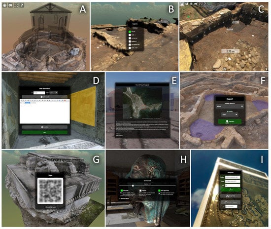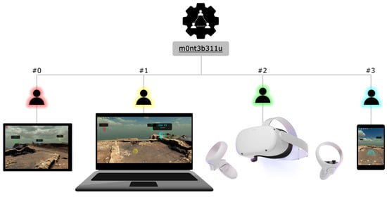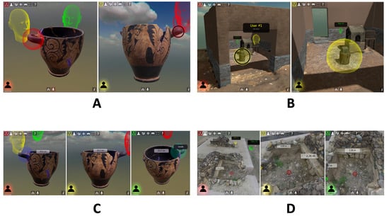 Collaborative Web3D—There is indeed a strong interest in the literature for CVE (Collaborative Virtual Environments) widely investigated for desktop-based applications [33,34,35]. The possibility to share the same virtual 3D space and interact with other people, became even more appealing during the COVID-19 pandemic [36]. Most of the recent literature is focused on social VR [37] paradigm, which is gaining more and more attention on desktop-based applications. There is already a robust literature on taxonomy [38] supporting the design of these applications, alongside user experience [39] and highlighting opportunities for CH [40]. Several works are also focusing on the importance of avatar representations [41] within social VR, and investigations related to personal spaces [42]. Within Web3D/WebXR contexts, there are a few works investigating synchronous collaboration, in which multiple users access the same virtual (immersive) space using common web browsers [43]. The most prominent example in the open-source panorama is certainly Mozilla Hubs (https://hubs.mozilla.com/, accessed on 22 November 2021) (based on A-Frame) that allows users to create online virtual meeting spaces, and it’s being used also for live workshops with children [44]. Recent research is also investigating multi-user collaboration through decentralized approaches for live coding environments in WebXR [45]. Regarding proprietary solutions, LearnBrite (https://www2.learnbrite.com/, accessed on 22 November 2021) is another collaborative web-based solution focused on micro-learning and instructor led training, allowing to create shared immersive scenarios across multiple devices. From a technical perspective, real-time communications are typically realized through web-socket protocol [46], often adopted for creating multi-player WebGL games [47] and 360 social VR experiences on the web [48]. These projects offer valid solutions for multi-user collaboration in Web3D/WebXR virtual environments, although not specifically targeting Cultural Heritage, and specific collaborative interactions/tools required for this scope.