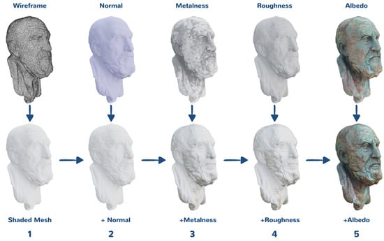 Standardization of Web3D formats—glTF (https://www.khronos.org/gltf/, accessed on 22 November 2021) (GL Transmission Format) by Khronos is a royalty-free, open standard for efficient streaming and rendering of 3D models and scenes [13]. It minimizes the size of 3D assets and the runtime processing required to unpack and use them. glTF is an extensible publishing format that streamlines authoring workflows and interactive services by enabling the interoperable use of 3D content across the industry. Particularly interesting is the support to the PBR (Physically-Based Rendering) model, crucial within the Cultural Heritage [14] and other fields to simulate advanced materials at runtime by approximating the flow of light. Furthermore, Khronos also recently released PBR extensions (https://www.khronos.org/blog/using-the-new-gltf-extensions-volume-index-of-refraction-and-specular, accessed on 22 November 2021) for glTF to support volume-based absorption, refraction (see Figure 1, top right), and complex specular reflections to be used by diverse renderers, from real-time rasterization to production-class path-tracing. glTF data like geometry can be also compressed: Draco (https://google.github.io/draco/, accessed on 22 November 2021) is an open-source library developed by Google for compressing and decompressing 3D meshes and point clouds. It is intended to minimize the storage and improve the transmission of 3D models over network connections. There are several open-source tools to perform Draco compression, and built-in glTF exporters in 3D modeling software (like Blender) already provide compression options for content creators. The glTF format is rapidly spreading and is being largely adopted by many platforms due to its high interoperability and perspectives to address specific archiving challenges [15]. Several 3D modeling software tools (Blender, 3DS Max, Maya, etc.) as well as game engines like Unreal Engine 4—can export directly in glTF (including PBR materials), thus boosting the web publishing workflow. Several institutions, including the Smithsonian, already published open-access 3D models using this standard (https://www.khronos.org/news/press/khronos-smithsonian-collaborate-to-diffuse-knowledge-for-education-research-and-creative-use, accessed on 22 November 2021). Furthermore, with the latest specification, Khronos is also preparing glTF to be submitted for transposition to an international standard.