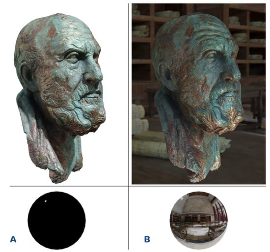 The core rendering system is based on Three.js (see Section 2), taking advantage of features offered by the open-source library for the presentation of CH objects, archaeological sites or generic 3D virtual environments. As previously anticipated, the interactive rendering fully supports the PBR model, thus providing advanced simulation of materials and how they react to the surrounding environment. The PBR model is widely adopted and well-established, especially within desktop-based content creation pipelines targeting applied games [54,55] and Web3D platforms like SketchFab. The workflow is well-defined within the glTF standard, with several properties (e.g., roughness, metalness, emissive, etc.) that—just like desktop-based pipelines—are generally encoded into multiple textures. Three.js PBR model is also compatible with WebXR, thus offering the final user a consistent simulation of the flow of light when consuming content through a stereoscopic device (i.e., high-end HMDs or cardboards).