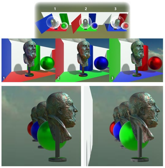 Common Web3D solutions (like SketchFab) offer a single light-probe [56] system to simulate a general response of 3D model surfaces to the environment (Figure 8). In ATON, a multiple light-probe system is provided: This allows to place and arrange multiple light-probes in a 3D scene, thus leading to a more consistent simulation of PBR materials in relation to the surrounding environment. Light-probes (LP) independently capture their surroundings, with each mesh automatically assigned to an LP depending on proximity, following a similar policy of game engines like Unreal Engine 4. This drastically improves the final result, with more consistent reflections and overall illumination for 3D items scattered across the scene (detailed discussion later in Section 4.2).