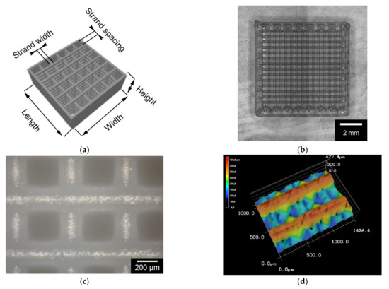 For characterization, the PCL scaffolds were weighed and measured. The length, width and height of the scaffold were measured, as well as the strand width and strand height (see Figure 1). At least five scaffolds were used in each case. The samples were approximately square with 8.55 × 8.53 mm base area. The scaffolds averaged 2.08 ± 0.02 mm in height and weighed approximately 75 mg. The strand widths were 234.7 ± 13.91 µm and the strand spacing 258.75 ± 9.62 (see Table 2).