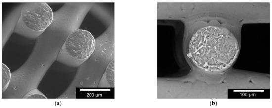 When measuring the strand width of different scaffolds, it was noticed that the width is not always constant (strand width: 234.7 ± 13.91 µm). As a result, there are always minor deviations in the pore size of the scaffolds. The deviations can have a variety of causes, such as the ambient temperature of the printer, an uneven printing substrate (Petri dish) or even a different temperature of the PCL during extrusion. The printer indicates when the printing temperature has been reached, but not whether the PCL has reached the set temperature everywhere in the cartridge. In this work, the minimum waiting time after the start of the heating process was at least 30 min.
