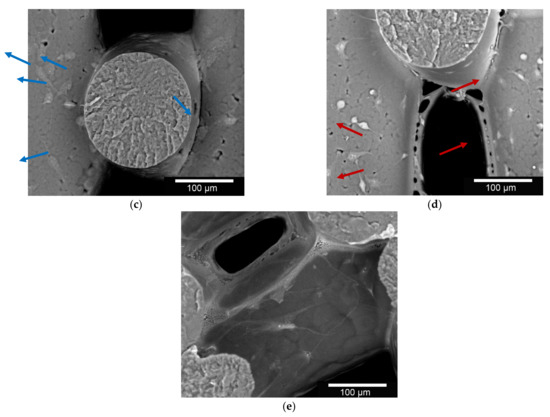 ESEM Images of the PCL scaffolds; (a): uncoated PCL; (b): collagen coated PCL (arrow); (c): MG-63 cells (blue arrows) on collagen coated PCL scaffolds; (d): MLO cells (red arrows) on collagen coated PCL scaffolds and (e): MSC (white arrows) on collagen coated PCL scaffolds; the cells were cultivated for 3 days on the scaffolds prior to ESEM measurements; Images taken with ESEM FEI Quanta 250 FEG, Large Field Detector, 20 kV acceleration voltage; 130 Pa; HFW 373 µm (Figure 3a 746 µm).