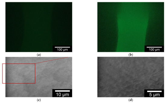 For the detection of the collagen layer on the scaffolds, an immunoassay was performed on randomly selected scaffolds. Collagen-coated scaffolds and untreated scaffolds were stained using immunofluorescence and observed under the fluorescence microscope (Olympus BX53, Olympus, Shinjuku, Japan). As shown in Figure 4 below, the uncoated scaffold does not fluoresce at all, whereas the collagen-I coated scaffold fluoresces bright green (Figure A1b in Appendix A shows another position). The exposure time for the image of the uncoated sample was 5x longer at 500 ms than for the collagen-I coated sample at 100 ms. Additionally, the characterization of the collagen-I coatings was also carried out by means of ESEM (FEI Quanta 250 FEG).