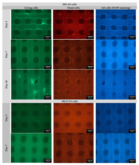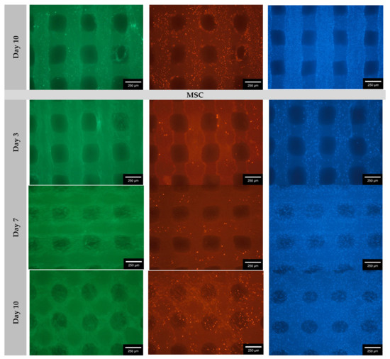 On each scaffold 100 µL of cell specific medium were pipetted with the following cell concentrations: MG-63: 25,000 cells/100 µL; MLO-Y4: 50,000 cells/100 µL; MSC: 50,000 cells/100 µL. The well plates were then incubated for 2 h at 37 °C and a CO2 saturation of 5% in an incubator. After two hours, 1 mL of the specific cell medium described previously was added to each well before incubating the well plates in the incubator for 3, 7 and 10 days. The staining solution was prepared by adding 2 mL DPBS (art. no. 14190-094, Gibco, Grand Island, NE, USA) to a Falcon tube (Greiner Bio-One International GmbH, Kremsmünster, Austria) and 4 µL ethidium homodimer III (Eth D-III) solution (together with calcein part of the Live/Dead Cell Staining Kit II (PromoCell, Heidelberg, Germany)) according to the manufacturer’s protocol (PromoCell). An amount of 1 µL of calcein dye was added after mixing the staining solution. All steps were performed in the dark to avoid photobleaching of staining solution and samples. To eliminate serum esterase activity, all samples at a time point had the medium removed and the cells washed. Staining was then performed according to a previously published protocol [19]. Evaluation was performed using an Olympus fluorescence microscope (BX51, Olympus, Osaka, Japan) at five different positions on the samples at 5× and 10× magnification.