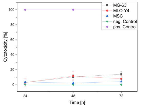After 24 h, no significant cytotoxicity is seen for all cell types. For the MG-63 and the MLO-Y4 this changes with the duration of the experiment, while for the MSC no cytotoxicity worth mentioning is seen even after 72 h. The cytotoxicity of the MG-63 and MLO increases somewhat after 24 h. For the MLO, the value decreases again after 48 h, while for the MG-63 it increases even more (Figure 6).