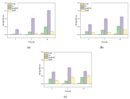Figure 7 shows the course of proliferation during the ten days of the experiment. In the cell culture plate with the remaining cells (C + R), hardly any proliferation can be seen in all three cell types at any time. Consequently, all cells adhere to the Thermanox membrane (C+). The number of cells remaining in the cell culture plate with the scaffolds (Scaff + R) increases over the experimental period of 10 days. The proliferation rates of the cells on the scaffolds (Scaff) differ. In MG-63 (Figure 7a), proliferation increases steadily over the days, whereas in MLO-Y4 (Figure 7b) it hardly increases from day 7 onwards and even decreases in MSC (Figure 7c). With regard to proliferation on the scaffolds, it can be summarized that proliferation increases for all three cell types in both wells (Scaff and Scaff + R) during the course of the experiment. However, a higher number of cells seem to migrate through the scaffolds in MG-63 and MLO-Y4 than in MSC. Cell proliferation on the scaffolds is highest in the MSC, followed by the MLO-Y4 and the MG-63.