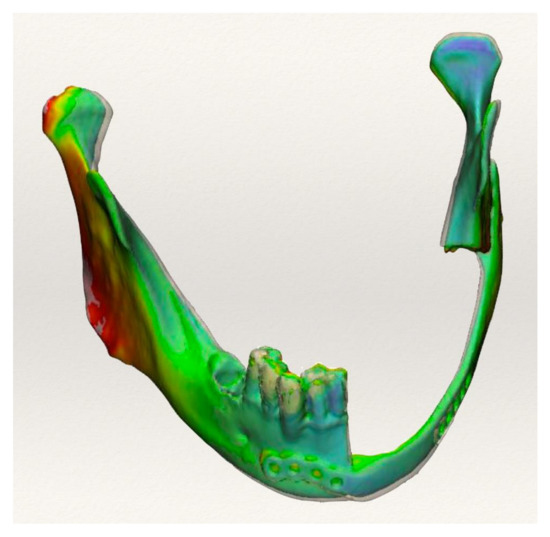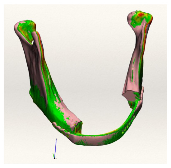 In our study, the accuracy of reconstruction was assessed using the automated Hausdorff distance function and, as the difference between the postoperative condition and virtual planning, it was feasible to automatically determine the lowest, maximum, and average error for each reconstruction. As a result, the human error that may have influenced the manual measurements was eliminated. Although this is an instant and automatic surface assessment tool, the superimposition tool may underestimate errors when two complicated three-dimensional models are overlapped. When a reconstructive plate is used as a reference point, however, this method appears to be highly significant for evaluating surface superimposition, and it appears to be more efficient in representing the accuracy of mandibular reconstruction than a linear measurements assessment or point-based analysis. Finally, the data coming out of this short retrospective study suggest how CAD/CAM microvascular reconstructions can result in a high degree of reproducibility. It is, however, relevant to point out the fact that the maximum error between the original planning and the postoperative CT scans is located in the symphysis area, while the remaining mandibular parts are characterized by a high degree of accuracy in reproducibility. This demonstrates the effectiveness of the CAD/CAM method in reconstructing complicated anatomical locations, such as the condyle and ramus areas. However, even considering the margin of error of the inaccurate overlap in the parasymphisis area, the surgical outcomes are still significant both from an aesthetical and functional point of view, overcoming the general comorbidities contra-indications.