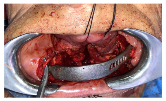When, necessary, the end oral defect was reconstructed with a soft tissue free flap transfer. The oral pelvi muscles were anchored to a grid of the customized plate to allow a quicker swallowing functional recover.
