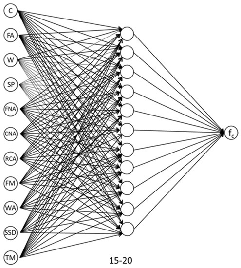 AI methods are useful to predict concrete parameters and they have been widely used in the literature. Recently, Artificial Neural Networks (ANN) have been used for estimating compressive strength of concrete [23,24] as well as other properties, since it is a powerful method for dealing with multivariable problems and generating easy-to-use models, even when the number of inputs is large. Artificial intelligence methods have been shown to be more accurate than multiple regression models (MLR) in predicting the compressive strength of concrete. For example, Patil et al. [25] have recently proposed an MLR to predict the 28-day compressive strength, taking into account the quantity of cement, natural fine aggregates, coarse recycled concrete aggregates, water, water-to-cement ratio, and the following aggregate properties: water absorption, specific gravity, aggregate impact value and aggregate abrasion value, finding R2 values less than 0.55 in the training phase and less than 0.75 in the test phase, which highlights the invalidity of the MLR method to predict the mechanical properties of concretes. These same authors also proposed an ANN model with a better accuracy than the MLR model. The R2 value of the ANN models was more than 0.8 in the training phase and more than 0.9 in the test phase, which shows that the ANN is a good alternative to predict the mechanical properties of RCA concrete.