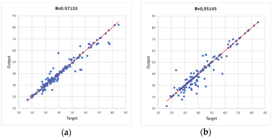 The Artificial Neural Network used in this work has 11 neurons in the input layer and only 1 in the output layer, and four sets of trainings have been carried out combining 15 and 20 hidden layers (Figure 1.) with the training methods of Levenberg–Marquardt (LM) and Bayesian Regularization (BR). The first one, LM, is recommended for nonlinear optimization problems and it is supposed to display a better performance than the traditional Gauss–Newton Method. The second one, BR, gives a better generalization when data are difficult [41]. So, four training processes have been carried out to obtain the best possible fitting of the synaptic weights. For the training process of the ANN, data have been divided into three sets: a training set of 123 datapoints (70%), a validation set of 27 datapoints (15%), and a testing set of 27 datapoints (15%).