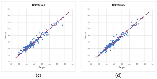 Figure 2. Correlations between target and output data for the four cases tested. (a): LM-15; (b): LM-20; (c) BR-15; (d): BR-20.