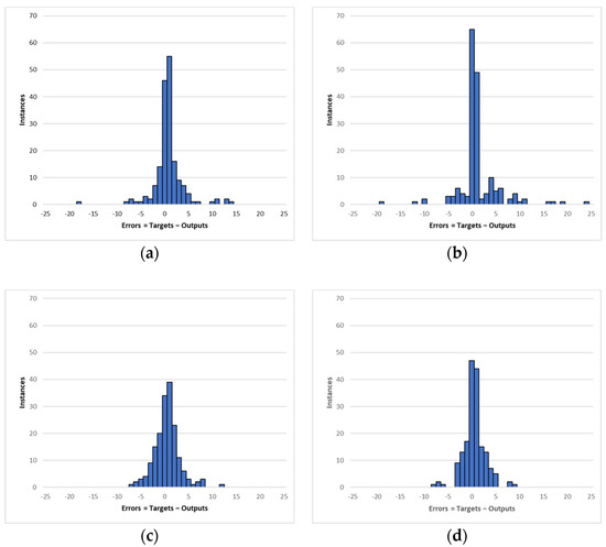Figure 3. Distribution of errors for the training methods tested. (a): LM-15; (b): LM-20; (c) BR-15; (d): BR-20.