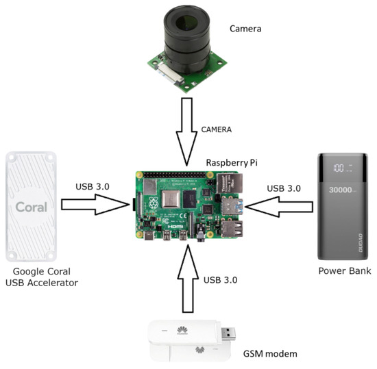 Detection of bees and of varroosis is carried out through the use of the Google Coral USB Accelerator. Thanks to the built-in Edge TPU co-processor, the Coral accelerator enables quick inference with Machine Learning (ML) models. The Edge TPU co-processor allows performing up to 4 trillion operations per second using only 2 watts of power [48]. This enables the implementation of modern mobile vision models with a speed of almost 400 frames per second in an energy-efficient manner. Moreover, the accelerator is compatible with the Tensor Flow Lite library. A general model of the monitoring IoT device is shown in Figure 1.
