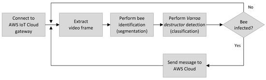 While having a network connection, it is possible to connect to the Cloud data center through the AWS IoT Cloud gateway service. For each frame of the recorded video stream, the IoT device performs bee identification (segmentation of bees) and Varroa destructor detection (the classification process). If the bee is classified as infected, the IoT device sends an MQTT message to the Cloud data center for further processing and notifying a beekeeper. The software organization is presented in Figure 2.