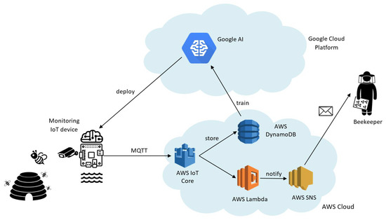 The solutions mentioned above do not fully respond to beekeepers’ needs. Although state-of-the-art papers about bee monitoring exist, the vast majority of them refer to controlling the conditions in- and outside the beehive. Moreover, the technological stack applied in most of the above does not stand with the cutting edge devices and algorithms. There are no comprehensive solutions that include image analysis based on edge-processing that could be easily scaled for multiple beehives and would not affect bees at the same time. Meanwhile, it is worth noting that scalability and fault tolerance are important issues while developing complex, network-based systems, such as the one presented in this paper. The decentralized solutions that use Peer-to-Peer connections (P2P) instead of the traditional Master–Slave approach feature good time performance with basically no loss of accuracy of data transmission [47]. Moreover, the P2P types of frameworks are less susceptible to network breakdowns due to the dysfunction of one of the peers, which makes the solution more scalable. The lack of such properties among the existing solutions led us to develop the presented approach that responds to the mentioned needs and fills these technical gaps. Our approach satisfies the scalability of performed analyses through TPU acceleration and the scalability of the monitoring process through IoT-dedicated cloud components. Fault tolerance is achieved by a redundancy of the IoT components, which is native to the cloud. Our proposal, presented in this paper, extends the current spectrum of existing works by:
