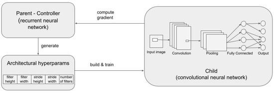 - Zoph, B.; Le, Q.V. Neural Architecture Search with Reinforcement Learning. In Proceedings of the ICLR 2017, Toulon, France, 24–26 April 2017. [Google Scholar]
