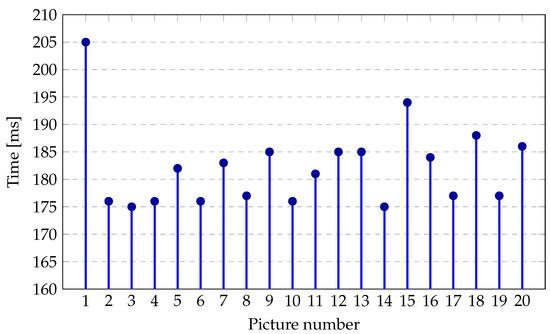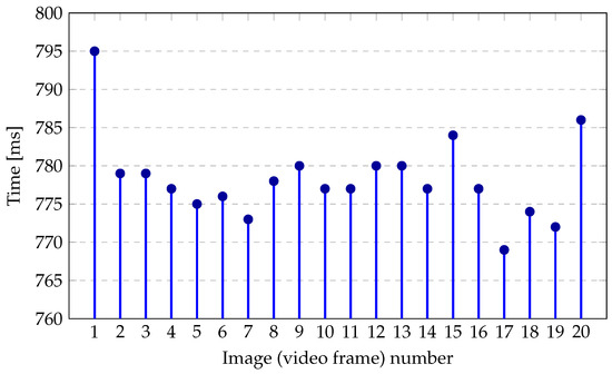 The time performance of the bee identification process was analyzed for each of the 20 images (video frames) that were input as data for the bee identification classification model. In addition, for the experiments, we chose images in the highest possible resolution of 2592 × 1944 supported by the device’s camera, which gives 5 Mpx. The outcome is presented in Figure 8. We can notice that the time needed to process an image was similar for most of the video frames. It took a maximum of 795 ms to analyze image no. 1 and a minimum of 769 ms to analyze image no. 17. The average time of processing a single image extracted from the video stream was 778.25 ms, whereas the standard deviation was 5.37 ms. It is also worth mentioning that there was no clear relationship between the number of identified bees and processing time for the video frame. Taking all of the above into account, the obtained results are satisfactory.