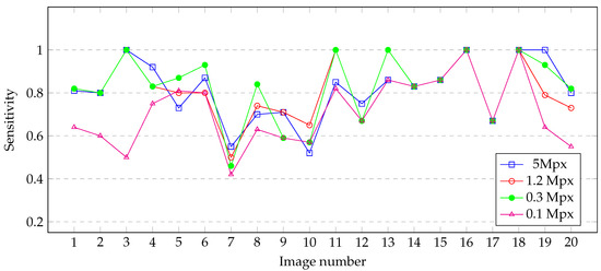 We noticed much more diversity for sensitivity, which is presented in Figure 10. For camera resolution 0.1 Mpx, the sensitivity was the lowest for most of the analyzed images. Nevertheless, for the other three resolutions, obtained results are close to each other, and differences between them are rather small. The average sensitivity of 0.77 was noted for the two highest resolutions (5 Mpx and 1.2 Mpx), 0.78 for 0.3 Mpx, and 0.68 for the lowest resolution (0.1 Mpx).