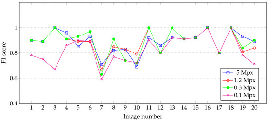 Figure 11 shows the F1 score measure obtained for particular images in tested resolutions. For some of the processed and analyzed images, the camera resolution does not influence the bee detection process. There are some images for which the camera resolution is important, which is also confirmed by the average value of the F1 score. As it was also visible for the sensitivity, the worst results (with the average F1 score reaching 0.81) were noticed for camera resolution 0.1 Mpx, while for other resolutions, the score reached 0.87.
