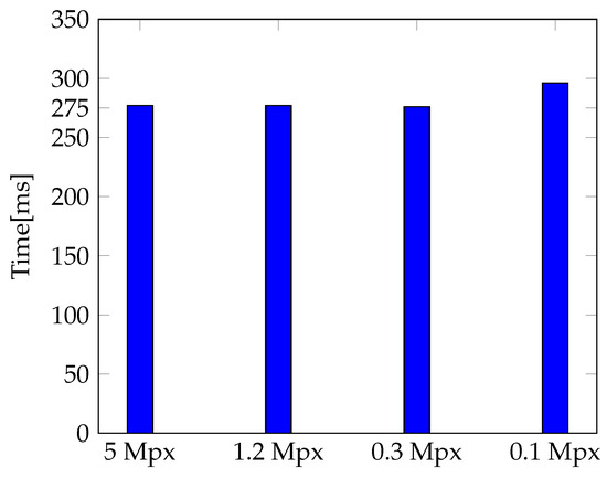 In the last part of the experiments, we investigated the influence of the image quality on the time performance of bee identification and V. destructor detection processes. Experiments were performed for the same four resolutions (5 Mpx, 1.2 Mpx, 0.3 Mpx, and 0.1 Mpx) and the same initial test set of 20 video frames. The analysis time (covering bee segmentation and varroosis detection) was measured for each image separately and averaged, first for all pictures of bees segmented from the image (ROIs) and then for all pictures of bees obtained for a particular resolution. Results are presented in Figure 12.