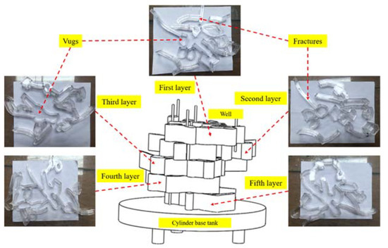 The three-dimensional visualized fracture–vuggy physical model is made up of five layers, seen in Figure 1. The height of each fracture–vuggy layer is 3 cm. The fractures and vugs were designed and engraved in each fracture–vuggy layer according to the actual fracture–vuggy reservoir structures and similarity criteria. The three-dimensional visualized fracture–vuggy model body was assembled by gluing and sealing each fractured–vuggy layer with epoxy. Afterwards, the three-dimensional visualized fracture–vuggy body was fixed to a cylinder tank with a height of 1 cm. The cylinder tank was used to provide bottom water. Finally, the pre-designed wells (S48, T401, TK411, TK426, and TK467) were drilled and extended into the specific positions, seen in Figure 2. The parameters of wells are displayed in Table 4. The well type depends on the borehole location. For instance, the vug well TK411 means that its borehole locates at a vug. One PV (pore volume) of the three-dimensional visualized physical model body is 1571.29 cm3, while the volume of the cylinder tank is 1384.74 cm3. Moreover, the three-dimensional visualized physical model is made of polymethyl methacrylate with oil-wet properties.