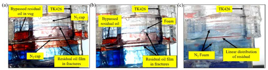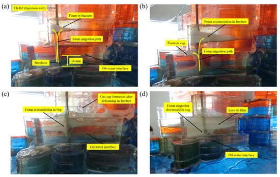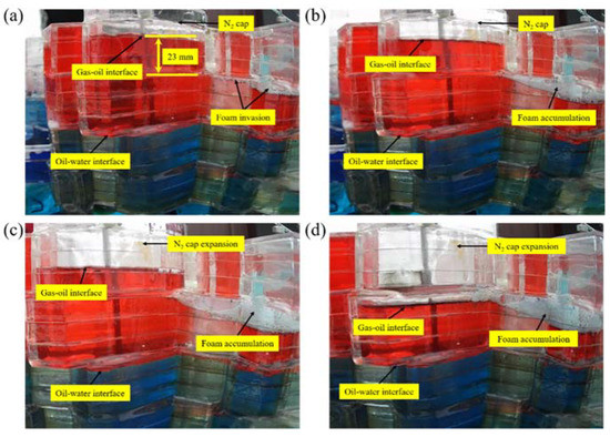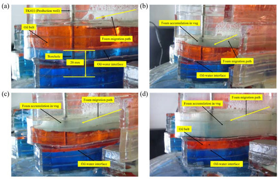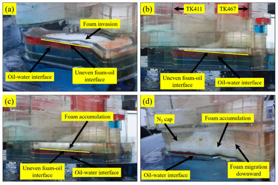 Foam cannot form a channeling path due to its low mobility, coating effect on N2, and Jamin effect when flows in the fracture–vuggy units [30,37]. The foam accumulation in a fracture–vuggy unit can increase the flow resistance of N2 and inhibit the N2 channeling formation, resulting in the increase of sweep efficiency [30]. This accumulation behavior in the top of a fracture–vuggy unit can also suppress the rise of bottom water. The vug, locating between wells TK411 and TK467, is almost submerged by bottom water before foam invasion, as shown in Figure 7a. The N2 foam gradually enters the vug due to the excellent connectivity between the vug and well TK467. However, the foam–oil interface (FOI), seen in Figure 7b,c, is not horizontal, unlike the N2–oil interface [22]. The FOI away from the injection well is higher than that close to the injection well. The N2 with a lower flow resistance can evenly accumulate in the top of the fracture–vuggy unit, while the N2 foam with a higher migration resistance preferentially accumulates in the top of the fracture–vuggy unit close to the injection well [29,30]. With the foam injection, the N2 foam accumulates in the whole top of the vug, generating a downward-driven force. This force can suppress the rise of the OWI and inhibit the occurrence of the bottom water cone. Figure 7d shows that the foam slug moves downward with the N2 cap, and the OWI decreases back to the cylinder base tank. Finally, the originate oil belt between the foam and bottom water is recovered significantly, and especially, no residual oil film is left on the wall.