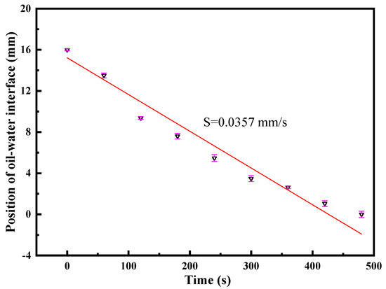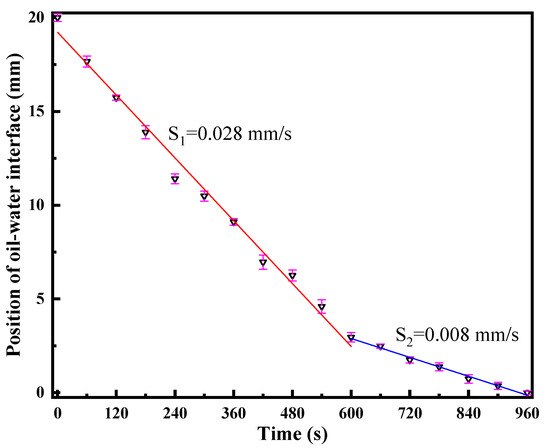 A graph depicting the evolution of the OWI position around the well TK467 with time is plotted in Figure 4. The slope of this curve represents the moving rate of the OWI. The injected foam accumulates in the fracture–vuggy unit’s top controlled by TK467 and then acts on the residual attic oil, leading to the OWI’s height decrease. The decline rate of the OWI height keeps stable at 0.0357 mm/s until the OWI decreases to the cylinder base tank.