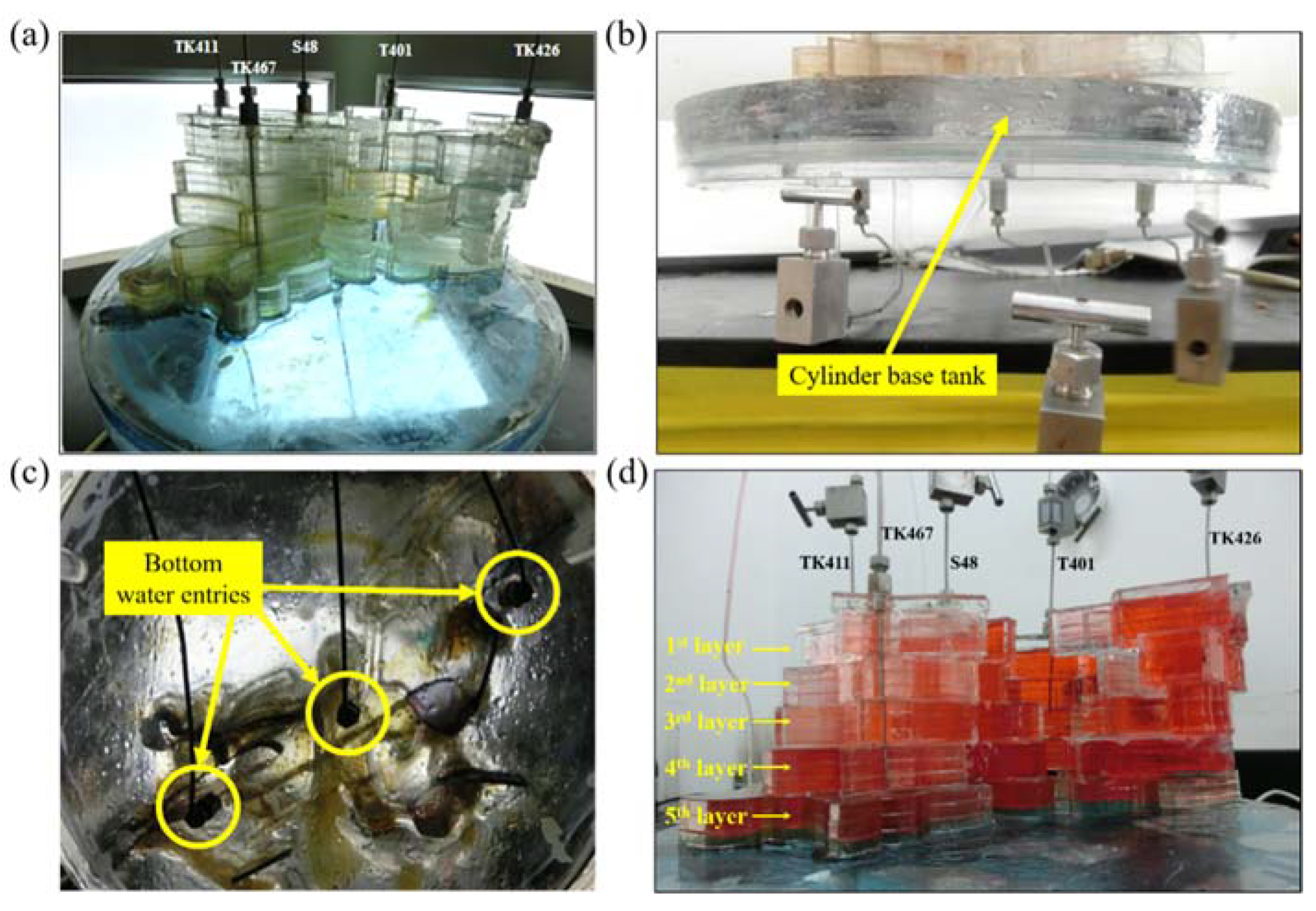 - The cylinder base tank is filled with simulated formation water from the model’s bottom, while the three-dimensional visualized fracture–vuggy model body is filled with simulated oil from the model’s top.