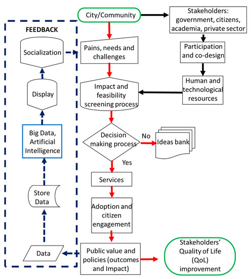 Figure 1 depicts the Smart City logical framework, including its various components and stakeholders or key actors. This framework begins with the needs and challenges the city is facing, called Pain Points [15]. A crucial step is an initial selective process or screening, during which the technical, economical, and social feasibility is considered by all stakeholders participating in the decision making process: citizens, government, academia, private sector, investors, and entrepreneurs (upper right part of Figure 1) [1,16]. The creation or modernization of public policies is a crucial step within this framework, especially in regards to the material, economic and human resources available to contribute to these projects and reach the goal of transforming a community or a city into a smart environment [16]. Moreover, feedback cycles are important to ensure an effective and efficient implementation of the project solutions. Feedback is based on data, digital technologies and interconnected visualization dashboards (Internet of Things, Information Systems, Artificial Intelligence etc. [2,11]) that allow the dissemination and socialization of the finished and ongoing projects. Finally, the framework’s main goal is to affect the different dimensions related to the Smart City’s habitability and QoL.