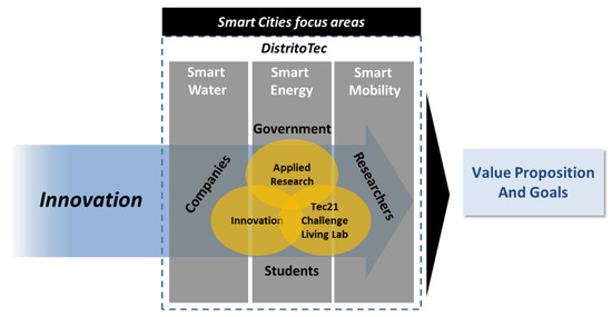Regarding the stakeholders in Figure 3, the industry refers to companies that are related to the production, consumption and distribution of water and energy resources, and to how people move around urban settings. These companies have already determined their strategies and technological roadmaps. They have their own research groups, but they are always on the lookout for highly disruptive external partners. The opportunity for universities lies in solving their current challenges from a disruptive perspective and identifying new challenges that they had not even imagined or thought of, complementing the blind spot that all companies develop. The government has designed and implemented public policy directives relating to water, energy and mobility. For this reason, the authorities must also contribute and make recommendations regarding the analysis and development of these technologies and solutions.