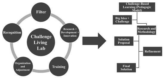 The main objectives of the Challenge Living Lab are systematic innovation, promotion of research efforts, formation of leaders, interconnectivity/data use and fostering multidisciplinary cooperation between public and private institutions with society. This includes a multidisciplinary communication effort between different institutions (university-companies) that provides information, data, technological, economical and human resources and different methodologies needed to promote research ventures that deal with different Pain Points. Moreover, the Challenge Living Lab strengthens and synergistically combines with Tecnologico de Monterrey’s academic programs; that is, the students are actively involved in different learning environments that lead to the development of solutions for the problems being experienced by the community, companies or campus users. This involves close cooperation between these stakeholders and collaboration with colleagues to develop socially responsible ventures [34]. To achieve this, Campus City can be integrated into the Tecnologico de Monterrey’s educational programs. Figure 4 illustrates the stages of the Challenge Living Lab, as well as the Challenge Based Learning pedagogic model.