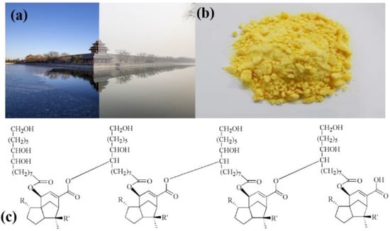 (a) A photo of a famous scenic spot in Beijing, which shows a clear and a hazy day on the left and right, respectively. (b) Refined shellac powder. (c) The chemical structure of shellac (R = CHO/COOH/CH2OH; R’ = CH2OH/CH3).
