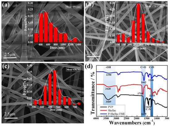 SEM images of nanofibers made from pure shellac (a), pure PVP (b), and P-Shellac (c). The insets in (a–c) are the diameter statistics of the nanofibers. (d) FTIR of three kinds of nanofibers.