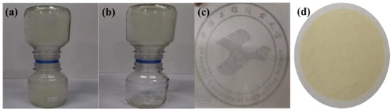 A simple filtration setup with (a) and without (b) P-Shellac FME between the top and bottom bottles. The top bottle was filled with PM fog. Optical images of P-Shellac FME before (c) and after (d) PM filtration.