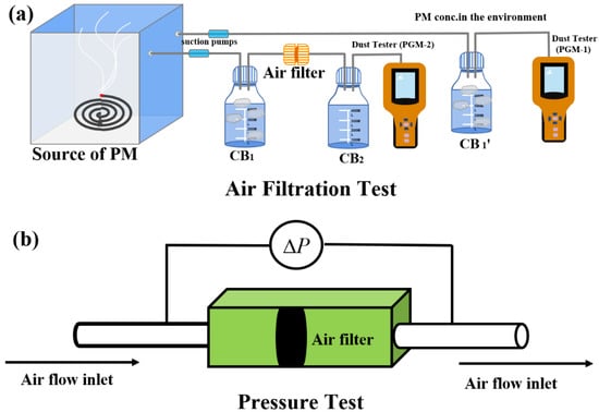 To exactly evaluate air filtration efficiency, we designed a setup especially for air filtration in our lab as shown in Figure 5a. Polluted air (mainly PM2.5 and PM10) was produced by burning incense in a closed acrylic box. Suction pump and dust analyzer (PGM) was used to control the rate of air flow and measure the concentration of PM, respectively. Dust analyzer 1 (PGM-1) was connected to collection bottle 1 (CB1’) with unfiltered air, while dust analyzer 2 (PGM-2) was connected to collection bottle 2 (CB2) filled with filtered air. Filtration efficiency was calculated according to the following equation: