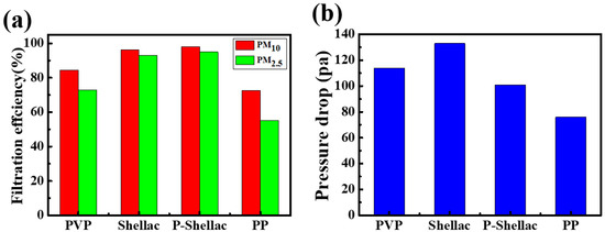 Besides filtration efficiency, air permeability is another important feature for air filters. Pressure drop measurement was then carried out as demonstrated in Figure 5b. At an air flow rate of 0.25 m/s, the pressure drops (ΔP) of FMEs for PVP, shellac, P-Shellac and PP were measured to be 114 Pa, 133 Pa, 101 Pa and 76 Pa, respectively (Figure 6b), which exhibited only 0.11%, 0.13%, 0.1% and 0.07% pressure drops with reference to atmospheric pressure (101,325 Pa). It was found that all the three FMEs have comparable air permeability to commercial filter PP. The filtration performance of FME is evaluated by a quality factor (QF) [36], which is defined as: