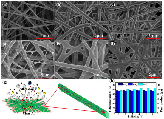 We then investigated the filtration mechanism of P-Shellac FME (Figure 7). To explore the filtration process in the FEM, the PM filtration by P-Shellac nanofibers at different times (0 h, 0.5 h, 1 h, 2 h, 3 h, 6 h) was characterized by SEM. Before air filtration started, the surface and edge of the P-Shellac nanofibers were smooth (Figure 7a). PM particles were randomly captured and adhered tightly to the nanofiber surface when polluted air flowed through the P-Shellac nanofiber network (Figure 7b,c). While the air filtration was taking place, PM particles gradually aggregated (Figure 7d), wrapped (Figure 7e), and diffused uniformly (Figure 7f) on the surface of nanofibers. The nanofiber surface became smooth again, although the diameter increased, which maintained the interspace of nanofibers and caused them to still possess good air permeability after 6 h of air filtration (Figure 7g). We also studied the reasons for the induction of interception and deposition of PM. In view of the molecular structure of P-Shellac, there are large quantities of hydroxyl and ester groups in shellac and larger dipole moment (around 2.3 D) in PVP [37]. The generated strong dipole–dipole and induced-dipole intermolecular forces could obviously increase the adsorption ability of P-Shellac FME [38]. FTIR characterization of three FMEs after air filtration showed that each of the three -OH, C=O and C-O stretching vibrations became weak, indicating the existence of an interaction between PM and nanofiber membranes (Figure S7).