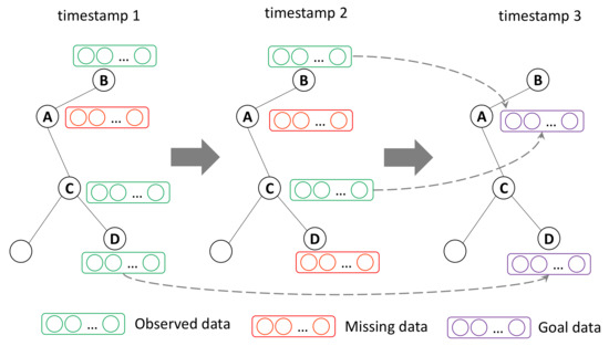 This study focuses on the problem of individual’s future emotion prediction in the context of irregular time series. The problem setup is illustrated in Figure 1. Given a social network in which each vertex (A, B, C, D) represents a user, there is an undirected edge between two users if they have a social network relationship. The users’ emotion data (from users’ posts and comments) are classified into three types. It includes the observed data (green boxes and circles), missing data (red boxes and circles), and goal data (purple boxes and circles). Every user’s emotion is represented by a six-dimensional vector, composed of the probability of six basic emotion categories (i.e., happiness, sadness, anger, disgust, fear, and surprise) proposed by [11]. The goal of this paper is to predict the emotions of users A and D at timestamp 3. To predict user A’s emotion at timestamp 3, the traditional methods utilize A’s previous emotion data at timestamps 1 and 2. However, in both timestamps 1 and 2, A’s previous emotion data were missing. Interestingly, neighbors’ (users B and C) emotion data can provide clues for predicting user A’s emotions. For instance, as the number of user A’s neighbors with happy emotions increases, the probability that the user will be happy continues to increase. It turns out that happy users influence other users to feel happy as well, which means that emotions spread through social networks [12]. These relationships are refered as the surrounding influence. The first challenge is to capture this surrounding influence and model the connection between the user’s future emotion and the surrounding influence.