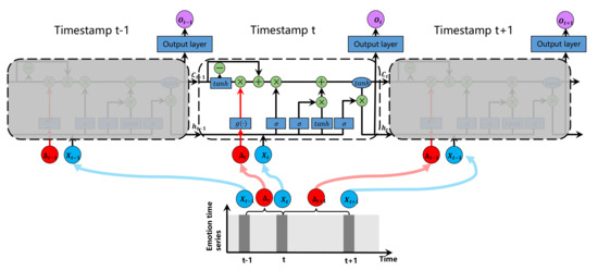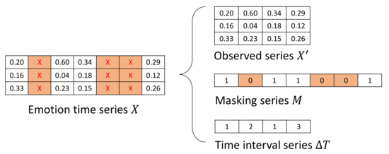 An example of the emotion time series X, observed series , masking series M, and time interval series is shown in Figure 2.