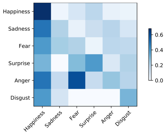An individual emotional state transition matrix (Figure 3) was obtained by analyzing the users’ individual emotional changes on the Microblog social network, which confirms the temporal correlations of the individual emotional states on the Microblog dataset. As the individual emotional state transition matrix is shown in Figure 3, the element in the i-th row and j-th column represents the conditional probability that the user’s individual emotion at time is x and that at time t is y.