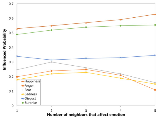 With the prevalence of online social networks, users can easily share emotions and influence each other. This subsection aims to explore the correlation between neighbors’ emotions and their impact on the user’s individual emotion. Specifically, users’ historical posts on the Microblog social network are mined. Then, their emotions in terms of what they share are analyzed. Futhermore, given a user v, when the emotion of the user’s neighbors at time is e, the probability that the user’s emotion is e at time t is computed. The results are shown in Figure 4.
