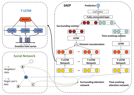 The proposed model aims to predict individuals’ emotions in the future for a given social network. Figure 5 shows the basic process of the proposed model. As shown in Figure 5, the proposed model consists of two main modules: A time-evolving attention network and a surrounding attention network.