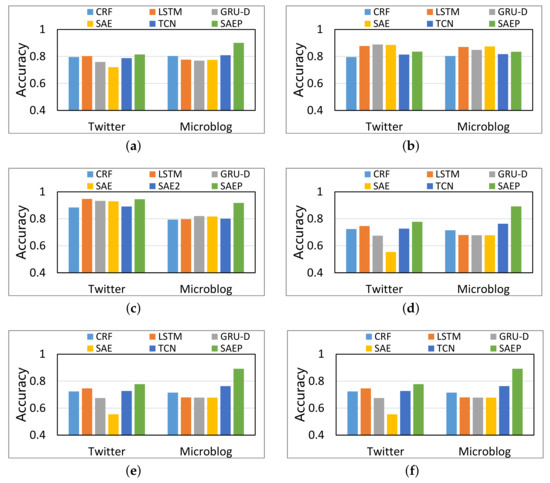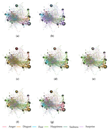 Finally, the emotion prediction results of different methods are visualized. Figure 14 shows the comparison of the seven methods on Microblog dataset. Figure 14a depicts the true emotions of users in Microblog social network in the future. Figure 14b represents the visualization result obtained by the proposed model. Figure 14c–g shows the results of the other five approaches. In terms of the micro F1 of emotion prediction, SAEP, CRF, LSTM, GRU-D, SAE, TCN reached 63.33%, 52.75%, 49.92%, 50.74%, 54.50%, and 56.03%, respectively.
