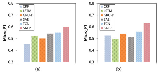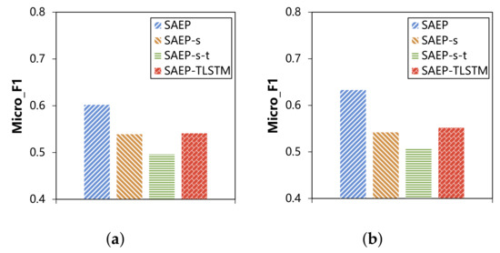 In addition, the performance of SAEP-TLSTM is not as good as that of the proposed complete model SAEP, which illustrates the decrease in the micro F1 when using the standard LSTM network as the encoder of the SAEP model. Evidently, T-LSTM as the encoder can effectively process irregular time series data, and in this way, the model performance is improved significantly. It is easily concluded that by using T-LSTM network to process irregular time series data and fusing time-evolving and surrounding influences, the SAEP model achieves the best prediction performance. Figure 10 suggests that the overall performances of the proposed complete model (SAEP) are better than that of the variants.