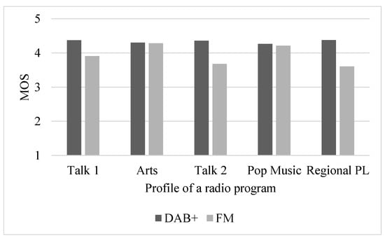 First, listeners were asked to rate the overall quality of each real-time DAB+ transmitted radio program over a period of approximately 10–20 s, separated by a 5 s interval, in a five-step MOS ACR (Absolute Category Rating) scale with no reference signal available from one (bad quality) to five (excellent quality). Next, this examination was performed for real-time FM broadcasted programs. Similarly as in case of DAB+, each radio program was presented over a period of approximately 10–20 s, separated by a 5-s interval. As previously, listeners were also asked to provide a score representing the overall quality in a five-step MOS scale, with no reference signal. In both cases, that is, FM and DAB+ signal quality evaluation, participants were not informed about the name nor profile and neither bitrate (in case of DAB+) of the currently assessed broadcast. Radio programs were presented in a randomized manner and labelled as Program 1–5. The results considering the quality of simulcasted DAB+ and FM radio programs are shown in Figure 1.